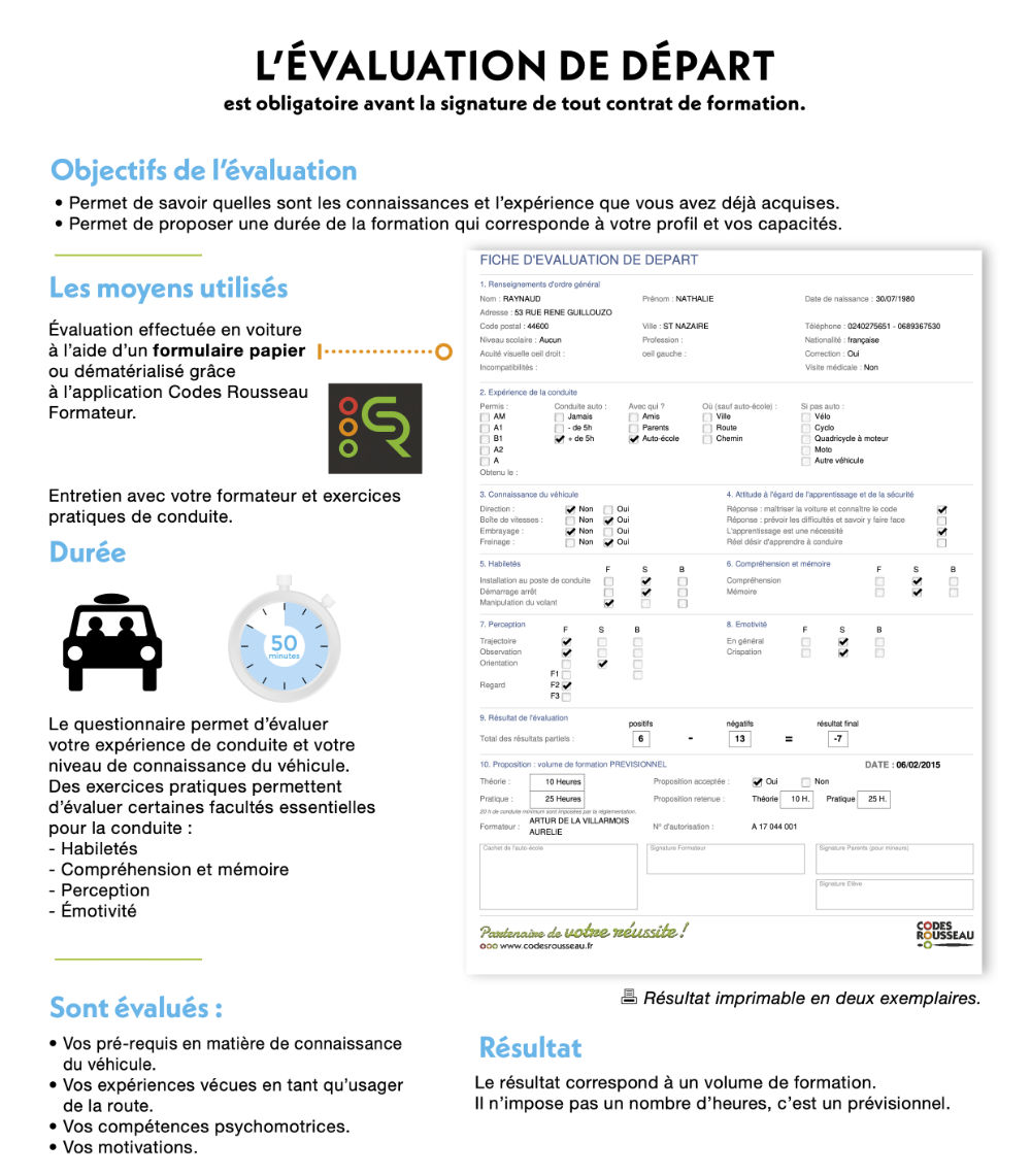 - Évaluation de départ pour estimer la formation nécessaire de l’élève et le nombre d’heures prévisionnel nécessaires.